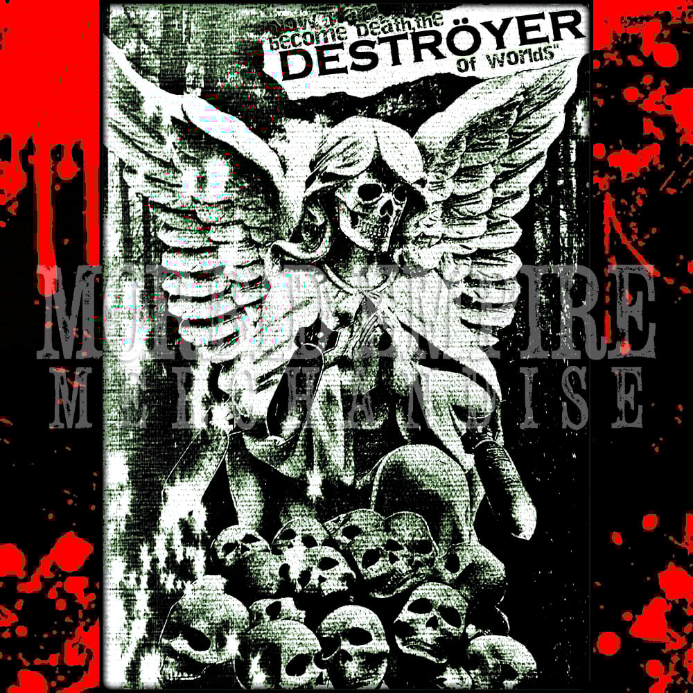 Front side: graphic design in pale green and white Back side: "destroyer of worlds" quote by Robert Oppenheimer